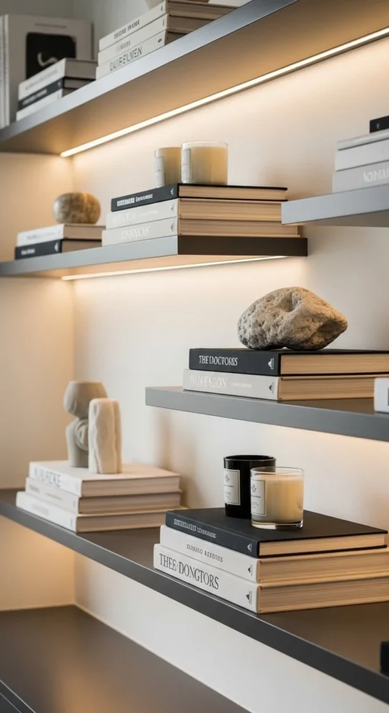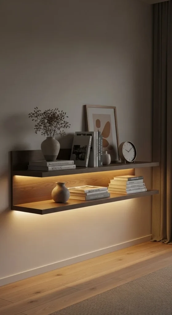 Lighting changes everything. A slim LED strip under the shelf highlights objects and adds mood. Warm light works best. Avoid cool tones. They flatten textures.