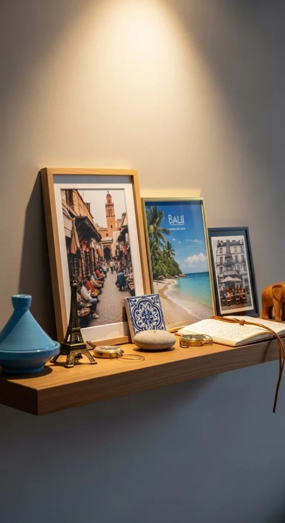 This idea works well in living rooms, bedrooms, or office walls. The shelf becomes a mini museum of your experiences, styled intentionally without clutter.