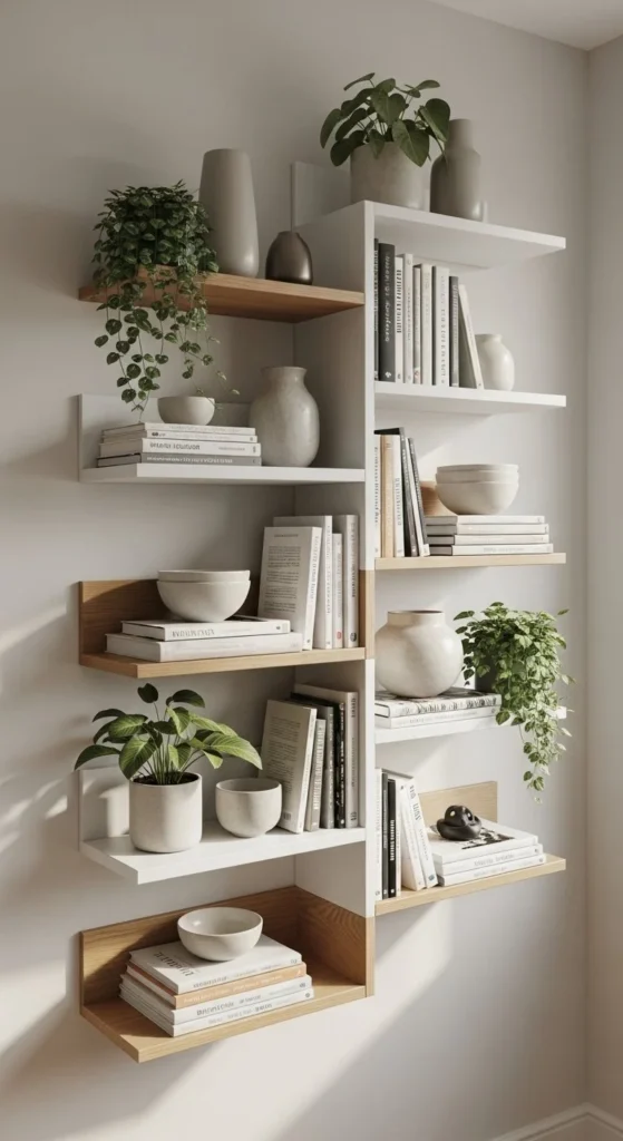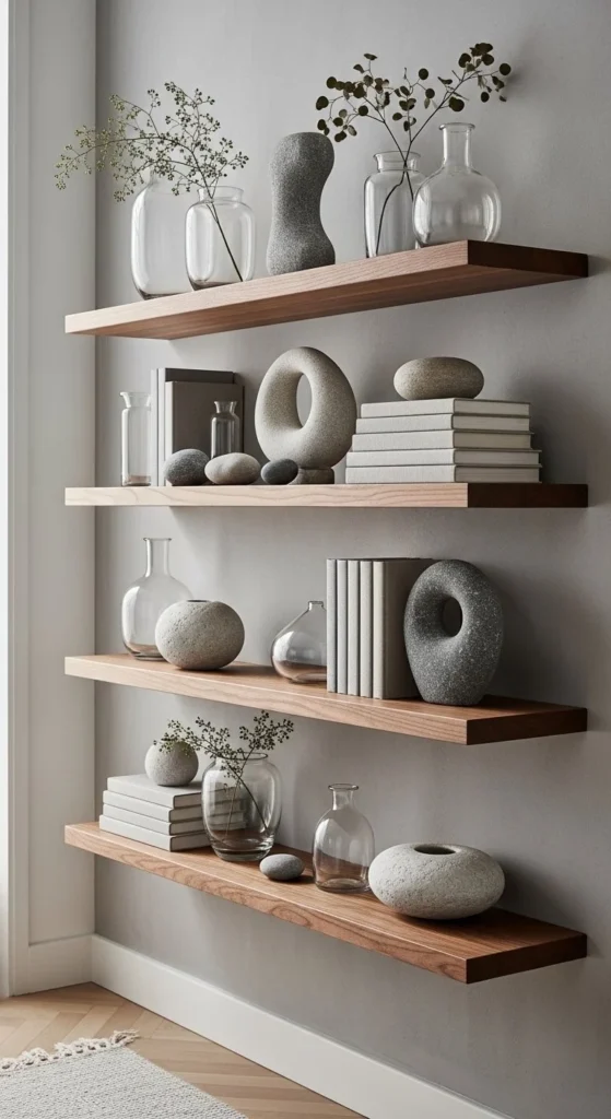 Vary spacing between shelves slightly. Perfect symmetry can feel stiff. A few inches difference adds ease. Place heavier items toward the ends. Lighter pieces near the center. This helps the wall feel balanced.