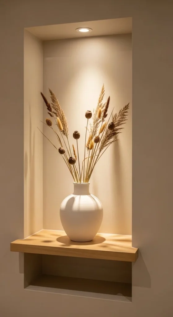 Small wall nooks are perfect for one striking item. A large ceramic vase with dried grasses creates impact without clutter. Statement pieces let a single item shine.