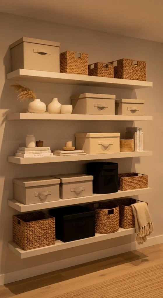 Place boxes on lower shelves for easy access. Style above them with lighter objects like frames or small bowls. This keeps the shelf from feeling heavy.