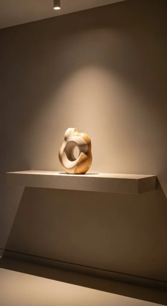 This approach suits modern living rooms and stairway walls. It also photographs well for Pinterest. Swap sculptures occasionally to change the look without redoing the shelf.