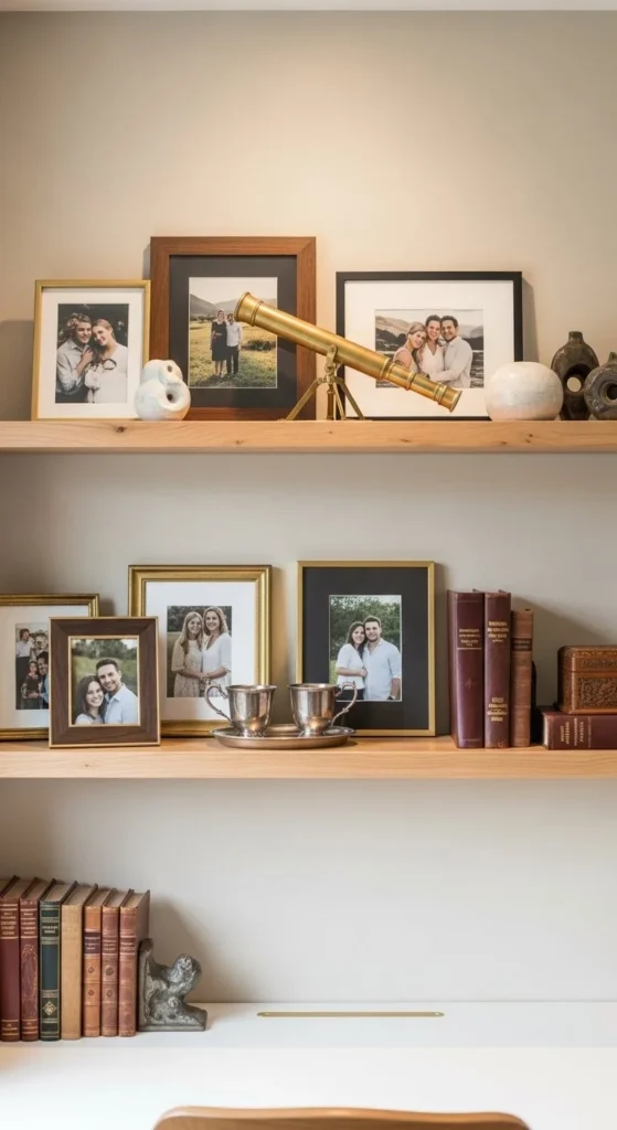 DIY frames can unify mismatched pieces. Paint all frames one tone. Matte finishes work best. Personalization through objects makes shelves feel lived-in without extra styling tricks.
