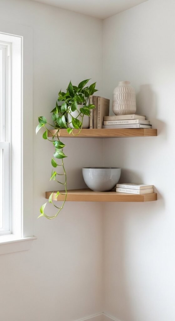Floating corner shelves turn ignored angles into working storage and decor zones. Corners often sit empty, yet they can hold plants, books, or daily-use items without eating floor space. Use simple L-brackets hidden beneath the shelf for a clean look. MDF boards work fine if painted, while plywood adds grain on a budget. Keep shelf depth shallow to avoid crowding the wall. Style vertically. One object per shelf keeps the setup calm. For renters, lightweight shelves with wall anchors or adhesive systems help avoid damage. Add trailing plants to soften hard edges. Stick to a tight color range so the corner reads intentional, not busy. Corners near windows work best for plants. In kitchens, use them for mugs or jars. In bedrooms, stack books and a small lamp. Vertical storage like this keeps rooms open while still feeling styled.