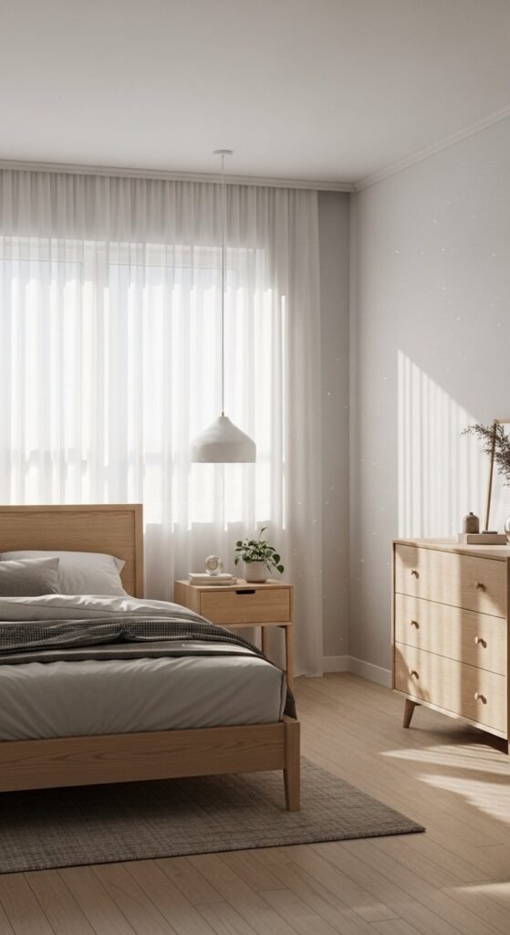 Heavy curtains block light and shrink rooms. Sheer panels do the opposite. They soften sunlight while keeping brightness strong. Hang curtains wider than the window to visually expand it. Floor-length panels add height even in small rooms. Use light fabrics like voile or linen blends. White or cream works best with neutral walls. Light control without darkness helps rooms feel open all day. For privacy, layer sheers with roller blinds. This combo keeps the look clean while staying practical. In studios, curtains can also divide zones without walls.
