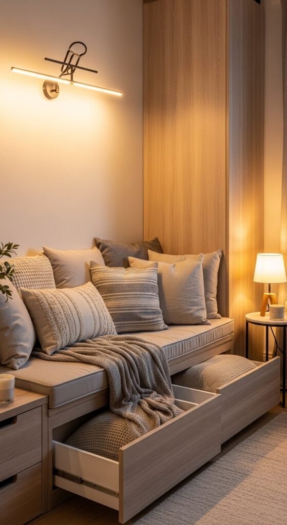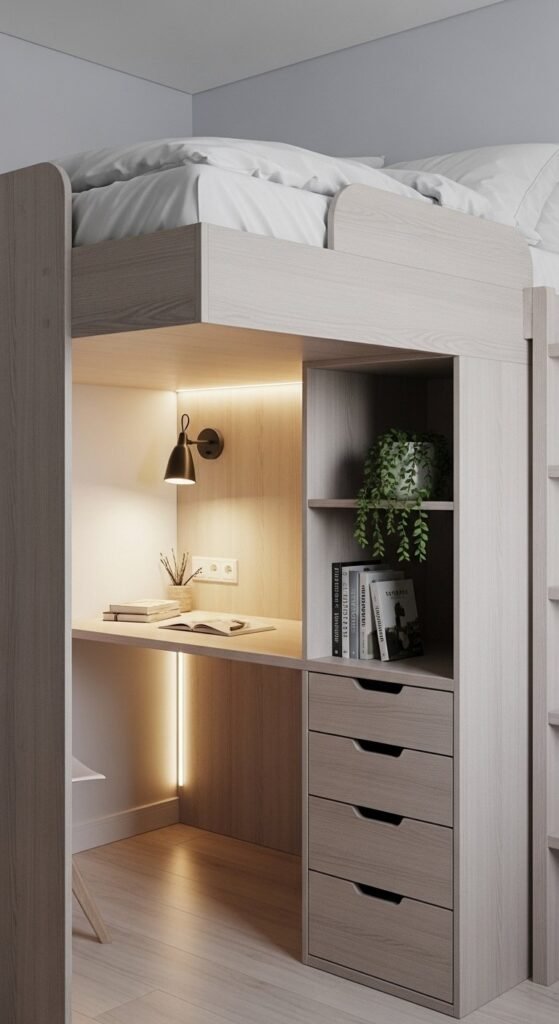 A loft bed clears the floor for daily life. Sleeping moves up. Living happens below. This setup works well in studios and teen rooms. Use ready-made loft frames or build a simple platform with plywood and solid posts. Underneath, add drawers, a desk, or open shelves. Curtains can hide storage if you want a calmer look. Keep the mattress height reasonable so the ceiling doesn’t feel close. Light bedding helps reduce heaviness overhead. Stick to built-in storage rather than extra furniture. That’s where space disappears fast. Multifunctional furniture like this keeps one zone doing double duty. Add plug-in wall lights instead of table lamps to save surface area.