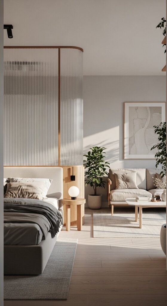 Fluted glass separates spaces without closing them off. Light passes through while lines blur details. This keeps privacy without darkness. Use black or brass frames for contrast, or wood for warmth. DIY kits with acrylic panels reduce cost. Install dividers from floor to ceiling for impact, or half-height for flexibility. Soft zoning helps studios feel organized without walls. This works for work areas, sleeping zones, or entryways. Keep surrounding decor minimal so the divider remains the focal point.
