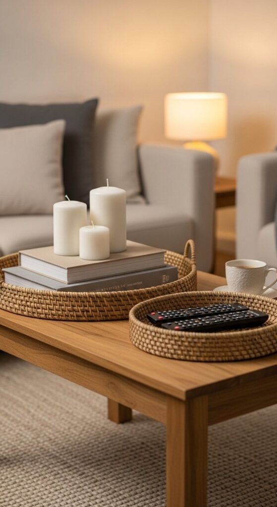 Small surfaces clutter fast. Woven trays group items visually and keep order. Use trays on coffee tables, desks, or dressers. Natural fibers add texture without weight. Stick to one tray per surface to avoid crowding. Rectangular trays work best in narrow rooms. Controlled grouping keeps essentials handy while looking styled. Trays also make cleaning easier. Just lift and wipe. For budget options, thrift stores often carry baskets that work just as well.