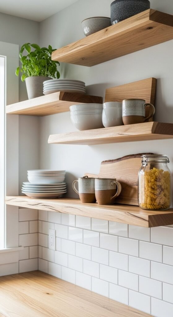 Live-edge shelves bring texture without bulk. Each shelf feels sculptural and personal. Use them in kitchens, breakfast bars, or entryways. Keep shelf thickness slim to avoid heaviness. Pair with white or neutral walls so the wood stands out. Seal the wood to protect from moisture. Natural texture accents help minimal rooms feel warm. Style shelves lightly. A mug, small plant, and bowl go a long way. Avoid stacking items deep. Let the shape shine.