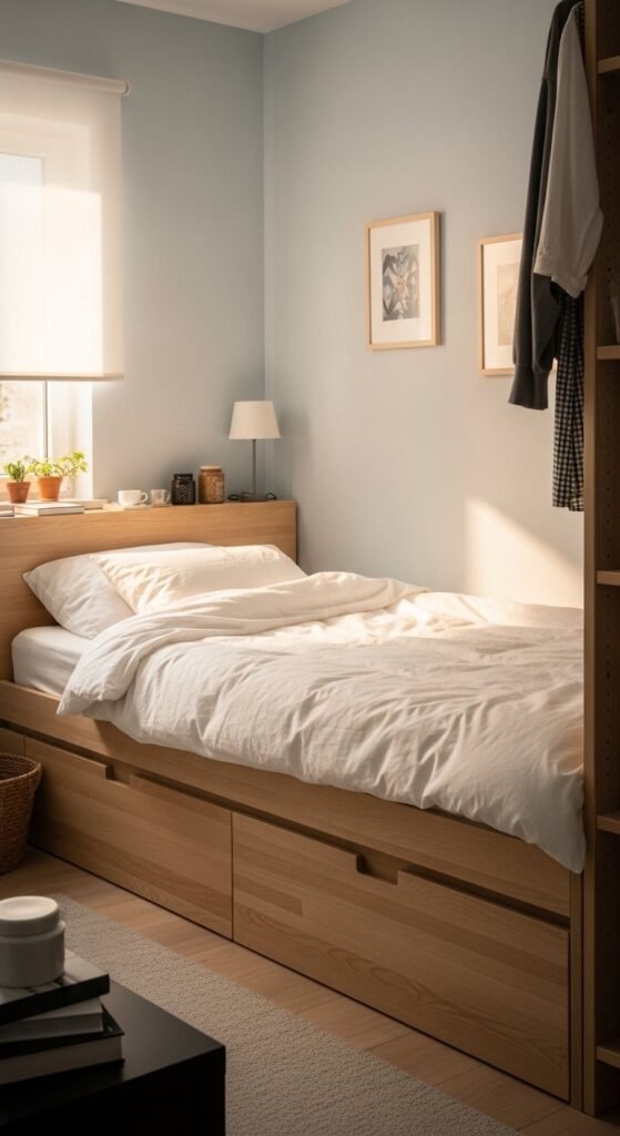 Beds hide valuable square footage. Drawers beneath turn it into storage without adding furniture. Use rolling bins if built-ins aren’t possible. Label containers to avoid digging later. Stick to soft items like linens or clothing. That keeps drawers easy to slide. Hidden storage zones help bedrooms stay calm and uncluttered. Keep drawer fronts flush so the bed frame looks clean. Light wood or painted finishes blend better in small rooms.
