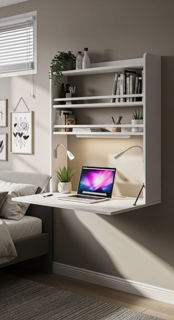 Fold-down desks disappear when not in use. Perfect for studios and shared rooms. Choose a desk with built-in shelves to store supplies. Mount it at standard desk height for comfort. Use a slim chair that tucks away easily. Space-flexible work areas keep rooms multi-purpose. Paint the desk the same color as the wall to reduce visual contrast. When closed, it reads like a cabinet, not furniture.