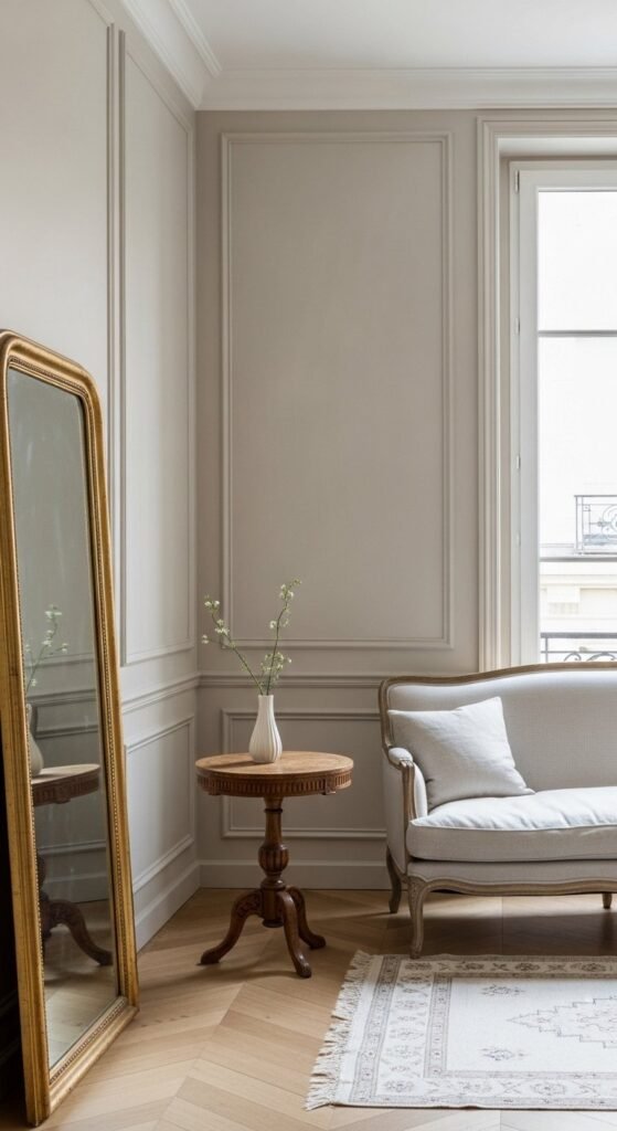 Molding adds detail without taking space. Thin trim keeps walls interesting while staying flat. Paint molding the same shade as the wall for subtle texture. This works well in small rooms where contrast would feel heavy. DIY kits or pre-cut trim lower costs. Surface-level detail adds character without clutter. Use molding on one feature wall to avoid overdoing it. Pair with simple furniture to keep balance.