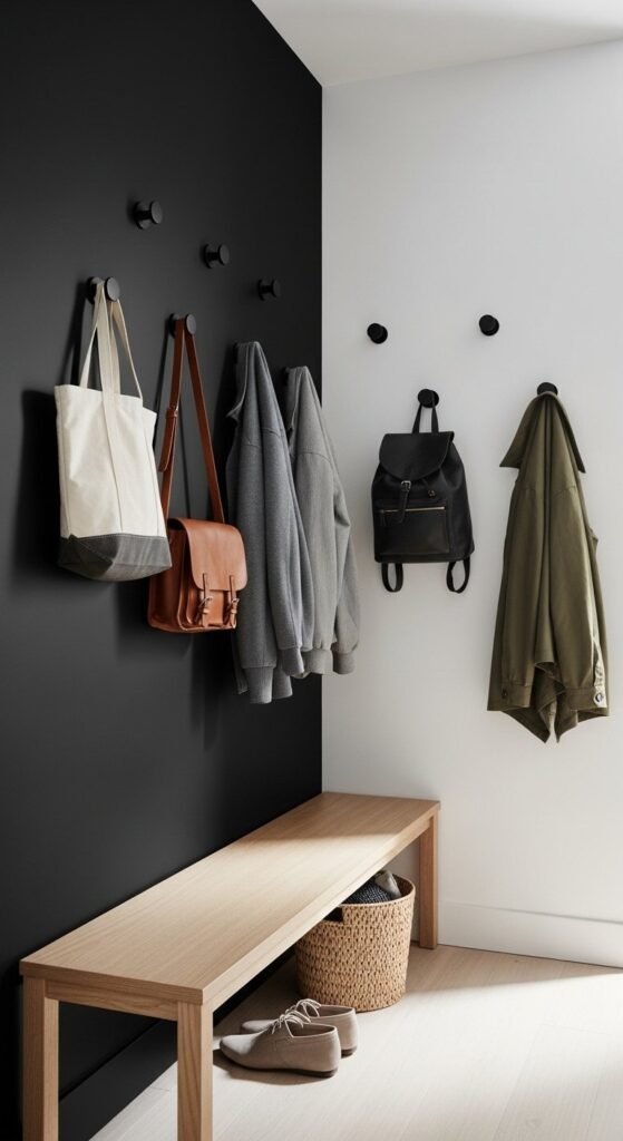 Wall hooks keep entryways usable without furniture bulk. Mount them in a straight line for visual order. Space hooks evenly so items don’t overlap. Use metal hooks for durability or wood pegs for warmth. Install above a small bench or shoe rack to create a landing zone. Wall-mounted organization clears floors instantly. For renters, adhesive hooks work for lighter items. Keep the hook count limited. Too many create visual noise. This setup works in hallways, bedrooms, and even kitchens for bags or towels.