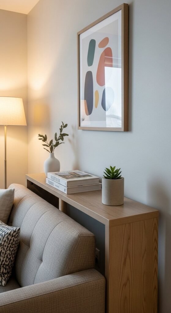 A narrow console behind the sofa adds function without crowding. Use it for lamps, books, or trays. Depth should stay under 10 inches to keep walkways open. Choose open-leg designs so light passes through. Dual-purpose furniture placement helps small rooms feel intentional. This works well in studios where the sofa floats in the room. Keep decor minimal so the table reads as support, not clutter.