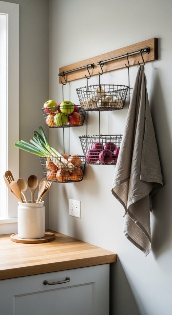 Hanging baskets turn walls into storage zones. Use them in kitchens, bathrooms, or offices. Wire baskets keep contents visible and light. Mount them vertically to save width. Label baskets if storing small items. Open wall storage works best when kept tidy. Stick to similar basket styles for cohesion. This setup costs little and installs quickly.