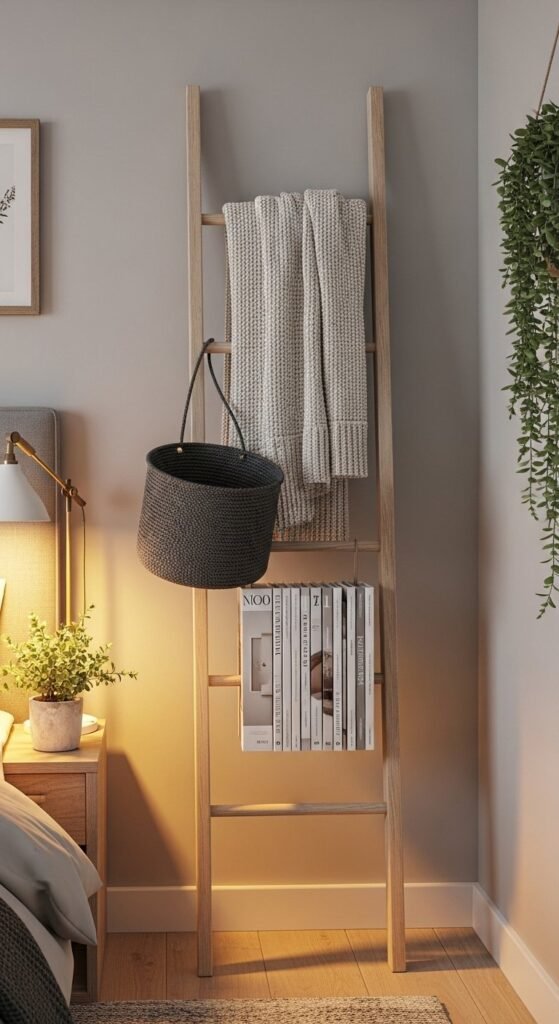 Decorative ladders offer vertical organization with zero installation. Lean them against a wall and start hanging. Blankets, towels, baskets, even plants work well. Choose wood for warmth or metal for a cleaner look. Keep spacing even so items don’t stack visually. In bathrooms, use them for towels. In bedrooms, throw blankets look relaxed but tidy. Paint the ladder the same color as the wall for a subtle effect, or contrast for character. DIY versions cost little. Two rails and evenly spaced dowels get the job done. Vertical storage like this avoids bulky cabinets and keeps airflow around the room.