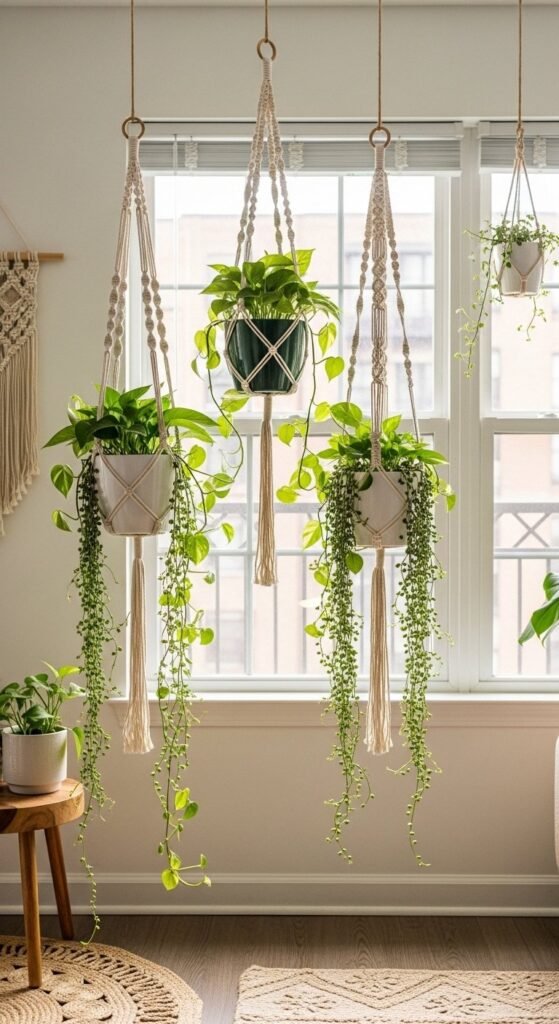 Plants bring life, but floor pots steal space fast. Hanging planters solve that. Suspend them near windows so light stays strong. Macramé adds texture, while simple metal holders suit modern rooms. Use lightweight planters to avoid stress on hooks. Ceiling anchors or wall-mounted arms work well. Mix trailing plants with upright ones to add movement. Keep pot colors neutral so greenery stays the focus. In kitchens, herbs thrive near light. In living rooms, plants soften hard lines from furniture. Greenery integration helps small rooms feel lived-in without clutter. Water carefully to avoid drips. Removable trays help protect floors and walls.