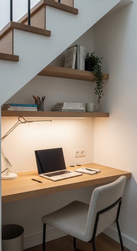 Under-stairs zones often turn into storage piles. With planning, they become productive corners. A slim desk fits most stair angles. Floating shelves above hold supplies without closing the space. Use wall-mounted lights instead of desk lamps to save surface area. Paint the area a light tone to keep it open. Pegboards add organization without bulk. Cable clips keep wires invisible. If depth is tight, choose a pull-out desk or fold-down surface. Hidden workspaces work best when styled simply. Keep only daily items within reach. Everything else goes behind drawers or baskets. This setup works for remote work, homework, or hobbies without stealing an entire room.