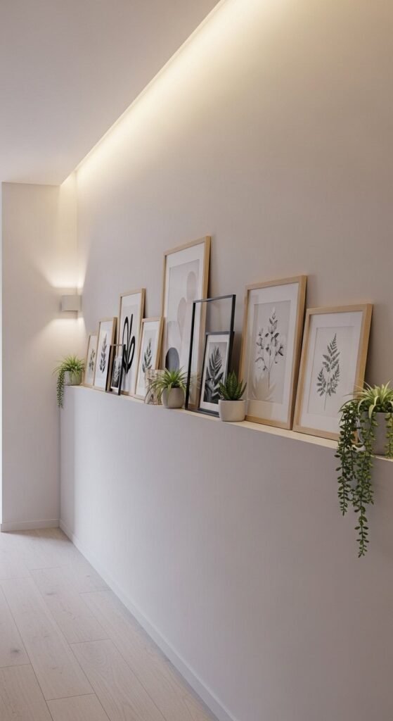 Picture rails let walls change without damage. Frames hang from hooks instead of nails. That means easy rearranging and no patching later. Install rails near the ceiling to draw the eye upward. Use thin frames so art doesn’t overpower the wall. Mix small prints with mirrors or postcards for variety. In rentals, adhesive rails work for lightweight decor. Wall styling without drilling keeps small spaces adaptable. Picture rails suit hallways, bedrooms, and dining areas. Keep color palettes tight so the display feels calm. Swap art seasonally to refresh the room without moving furniture.