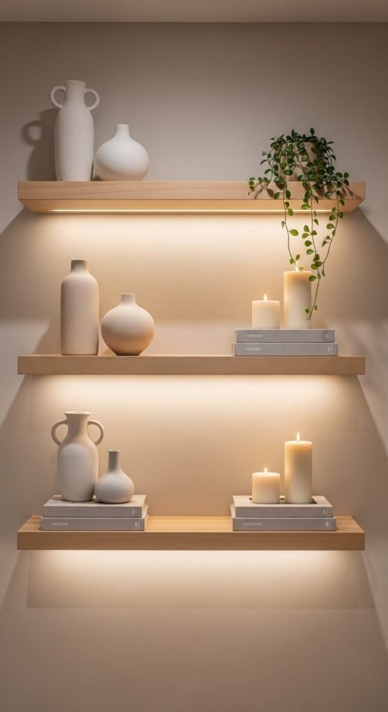 Symmetry brings order to tight rooms. Matching shelves calm visual noise and feel intentional. Install shelves at the same height and depth. Style them with balance in mind. One tall item paired with two smaller ones works well. Leave breathing room between objects. Crowding kills the effect. Use ceramics, books, and simple decor pieces. Avoid loud colors. Structured styling makes small rooms feel polished, not busy. This works especially well above sofas or desks. Keep shelf length modest to avoid heaviness. The goal is rhythm, not storage overload.