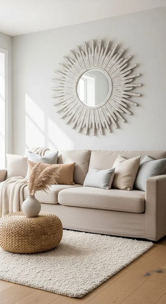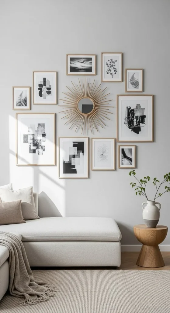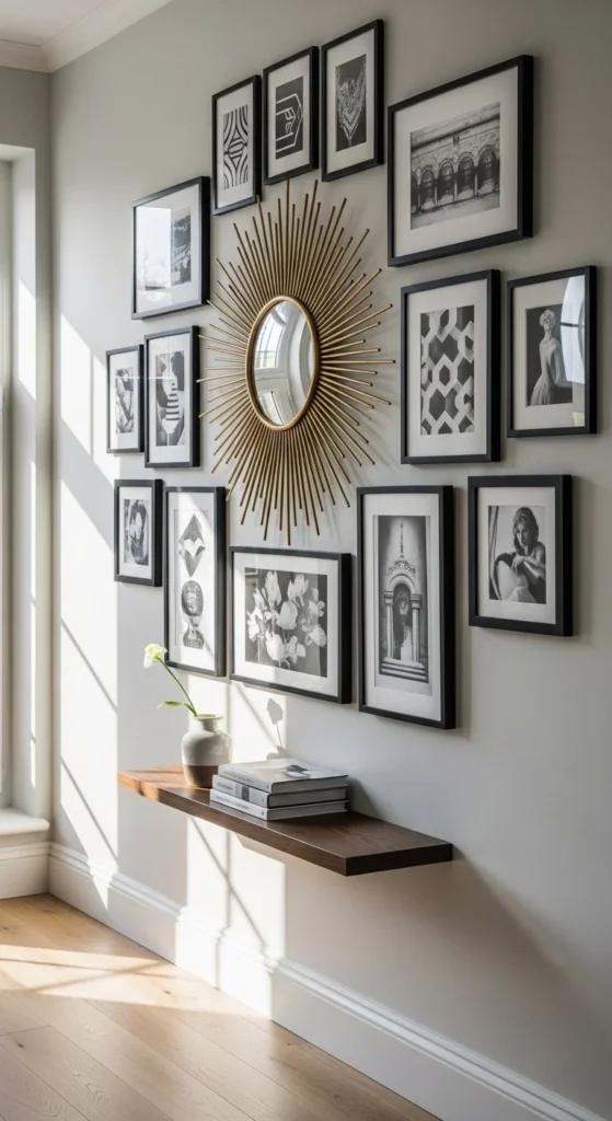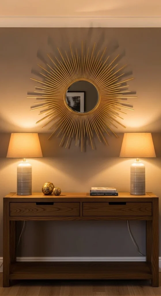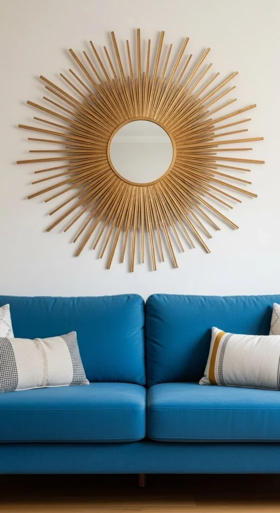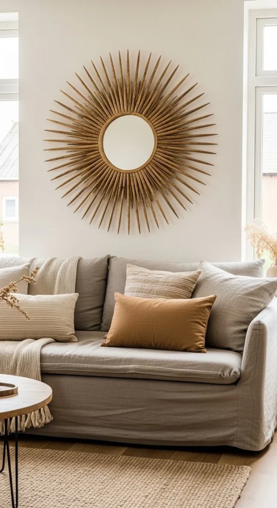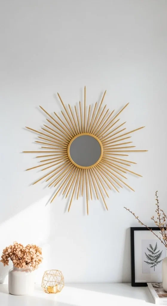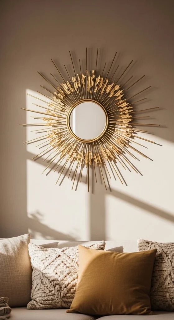 Place the mirror as the centerpiece among framed art. Sunburst mirrors break up flat galleries and add reflective contrast. Keep other wall pieces minimal so the rays don’t clash. Use symmetry or slight offset for visual interest. Lightweight builds allow you to combine multiple frames safely. Works in hallways, living rooms, and bedrooms. Metallic or natural tones blend seamlessly with black, white, or wood frames. This approach turns a simple wall into a curated focal point without additional furniture.
