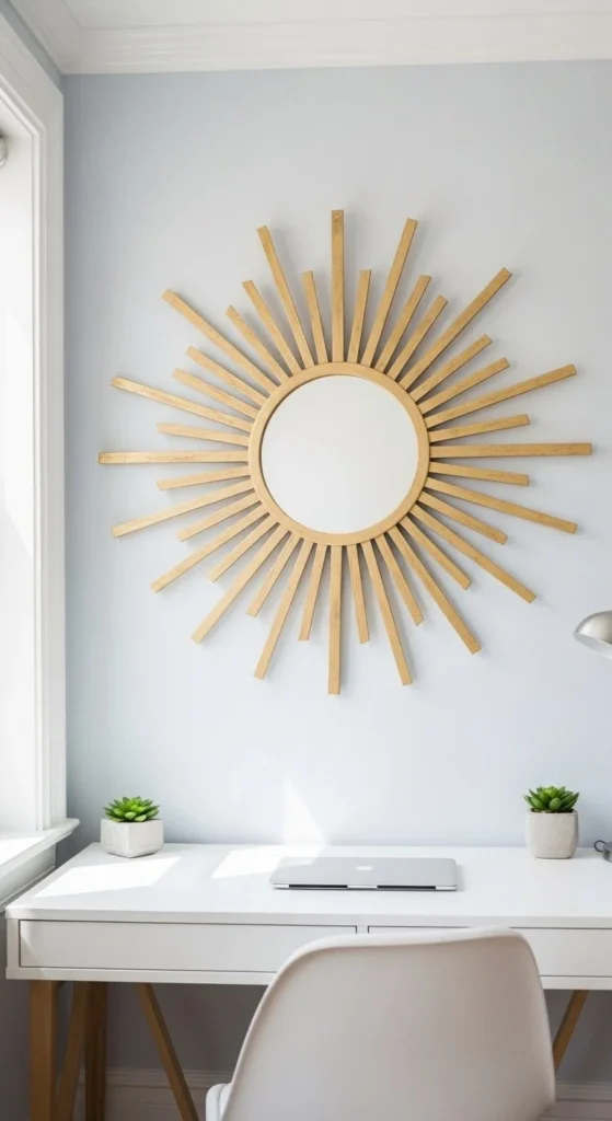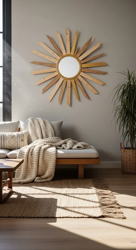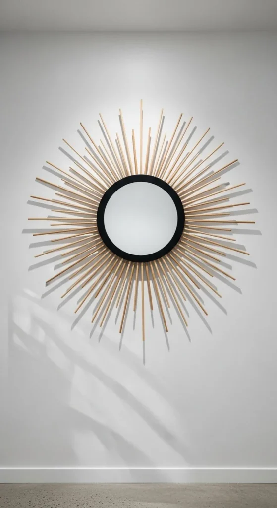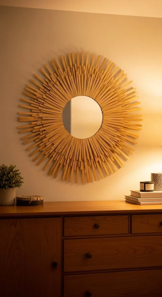 Combine natural bamboo with gold-painted rays for boho-chic flair. Mixing materials creates visual richness without adding weight. Start with a small mirror, expand with rays of different lengths, and layer carefully. Sand edges lightly to prevent splinters and finish with metallic spray for shine. Pair with woven textiles, plants, and neutral bedding for cohesive styling. Works best in bedrooms or living areas where casual elegance is desired. Even simple materials can feel luxurious when arranged thoughtfully.