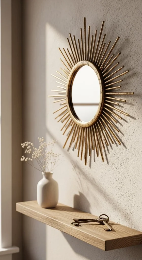 Even tiny mirrors can make an impact. Use thin rays and lightweight backing to avoid excess weight. Scale matters more than length here—shorter spokes prevent visual clutter. Hang above small shelves, hooks, or key racks in entryways. Spray paint in warm metallic tones for a polished finish. Keep the surrounding wall calm so the mirror reads as intentional. Perfect for apartments or small walls where space is limited.