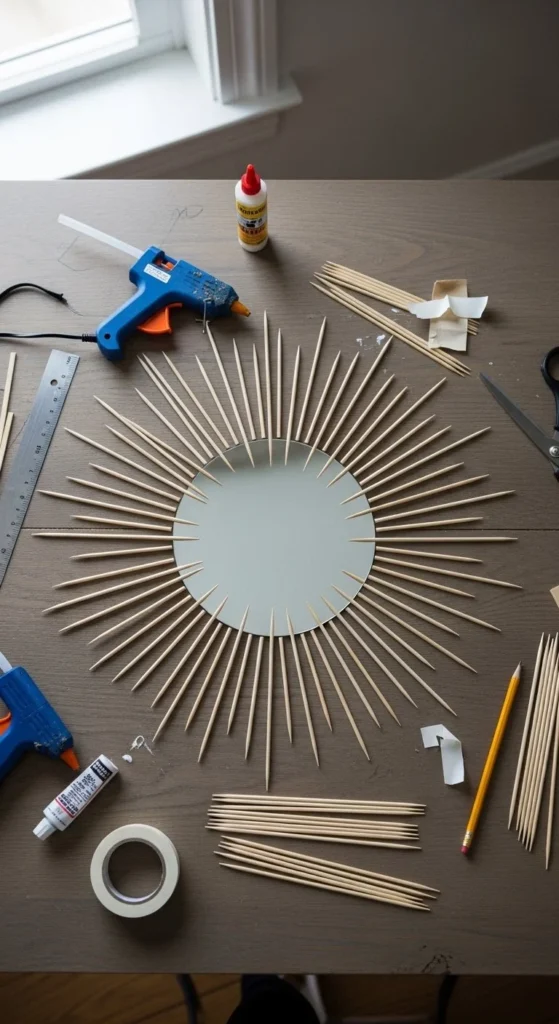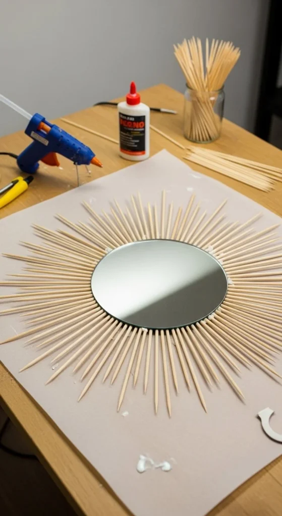 This version focuses on clarity rather than speed. Step one is measuring wall space. Step two is marking twelve positions around the mirror. Step three is gluing long spokes first. Step four adds filler rays. Step five finishes with sanding and paint. Clock-style layouts prevent uneven spacing, which frustrates beginners. Use a pencil to mark positions before gluing. Popsicle sticks or skewers both work here. Don’t rush the glue stage. Let sections dry before rotating the piece. Satin metallic paint hides flaws better than high gloss. This mirror fits offices, bedrooms, and hallways. Keeping the process structured makes the result look intentional, even if your cuts aren’t perfect.
