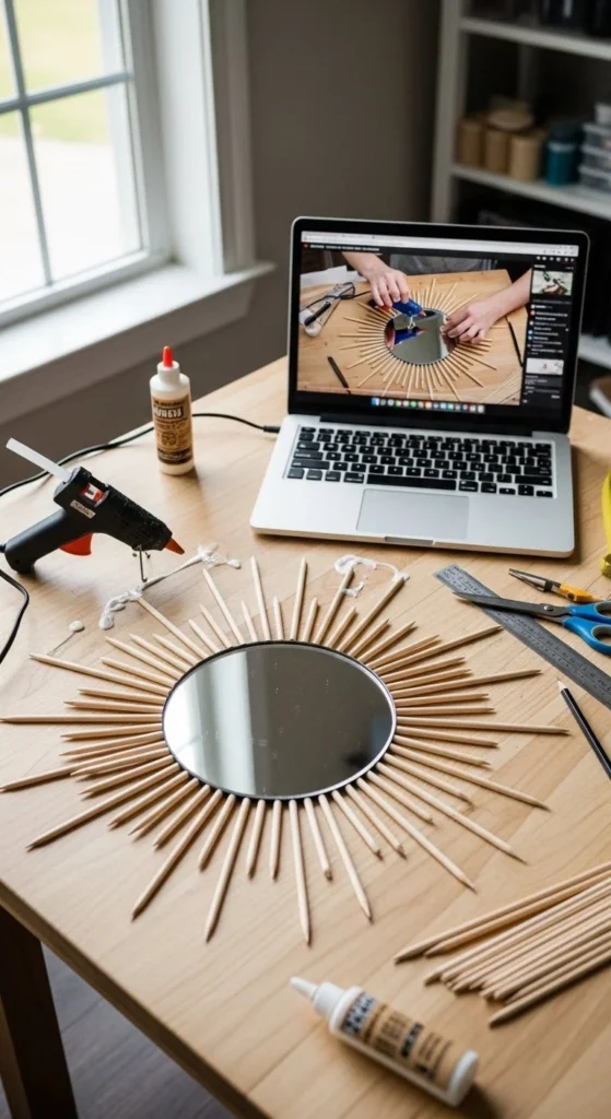 Follow video guides for extra clarity. You can see spacing, layering, and gluing techniques in real time. Visual guidance prevents common mistakes, like uneven rays or sloppy glue. Combine skewers, popsicle sticks, or spoons depending on your chosen style. Pause frequently to match your speed. This approach works well for beginners who prefer step-by-step instruction. Use the video as a reference, but adapt colors and materials to suit your space. It’s a great way to build confidence and ensure your mirror turns out as planned.