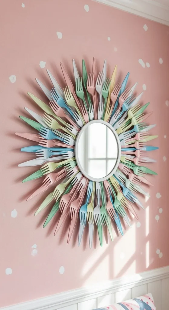 Plastic forks create a unique texture that spoons or skewers can’t achieve. Trim handles and glue the fork heads outward like petals. Layering adds depth and dimension, making the rays feel sculptural. Paint afterward for a unified finish. This technique works in bedrooms, craft rooms, or kid-friendly spaces. Lightweight plastic keeps hanging simple, even for medium-sized mirrors. Pair with neutral walls or soft pastel accents to keep the focus on the mirror itself.