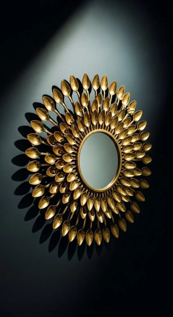 Plastic spoons create texture wood can’t match. Cut the handles cleanly so the spoon bowls sit flat. Arrange them like petals radiating outward. Slight overlap adds strength and depth. Glue everything first before painting. Painting after assembly keeps the finish consistent across layers. Use light spray coats to avoid drips between curves. Gloss finishes look bold, while satin softens the shine. This mirror works well in dining spaces, powder rooms, or dramatic wall moments. Keep the mirror center small so the rays remain the focus. Because spoons add bulk, use strong adhesive strips or wall anchors if hanging permanently. This style reads sculptural even from a distance, making it ideal for rooms where decor should feel expressive rather than subtle.
