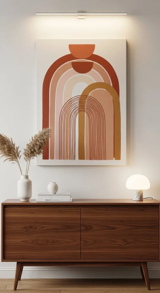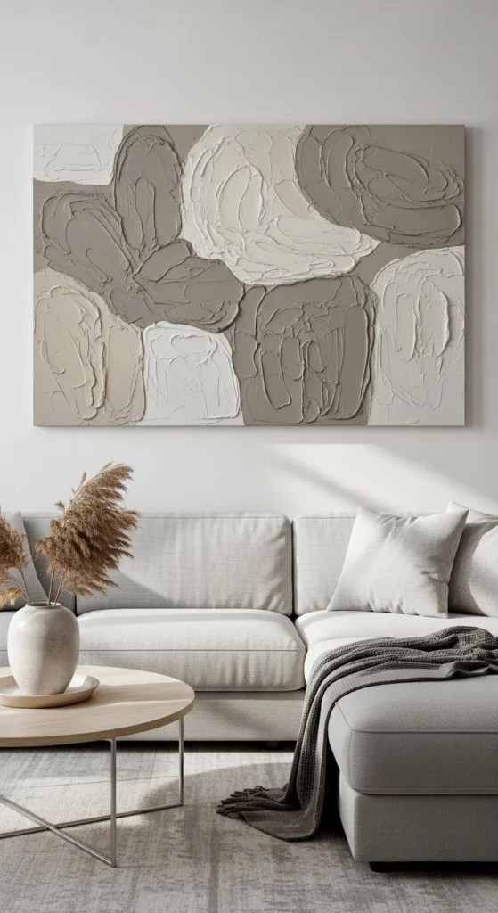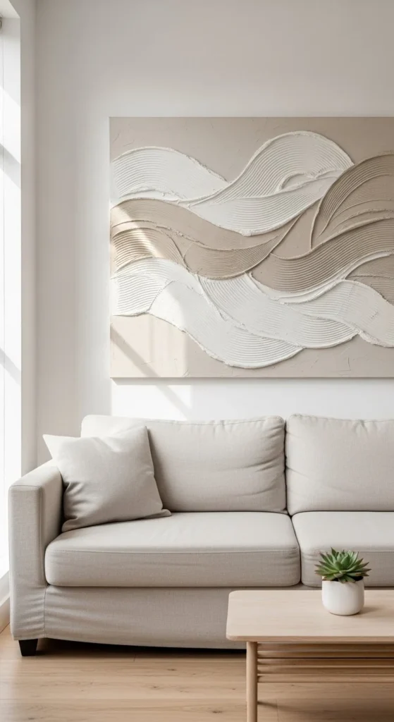 Hang a single oversized piece above a sofa. Or create a grid of smaller panels. Lighting matters. Side lighting enhances shadows and depth. This style suits minimalist, Scandinavian, and Japandi interiors. Even beginners can pull this off in a weekend.