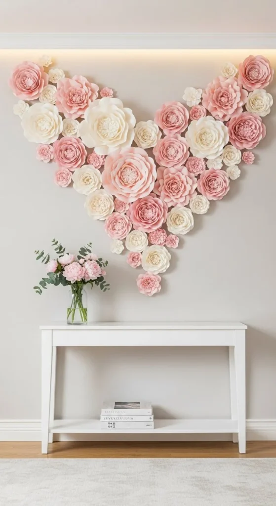 Paper flower walls feel sculptural. They add depth without heavy materials. Use cardstock or crepe paper. Cut petal layers in graduating sizes. Curl edges with scissors for realism.