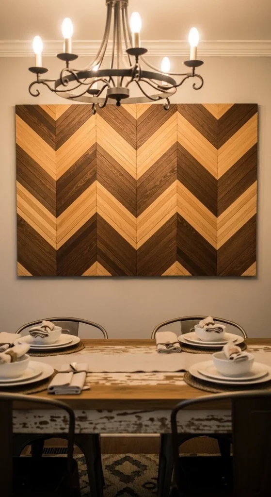 Hang above dining tables or mantels. The repeating pattern fills wide walls without artwork frames. Seal the wood to prevent splinters and enhance grain visibility.