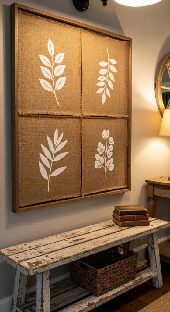 This piece suits entryways, kitchens, and mudrooms. Pair with galvanized metal decor or wooden hooks. Costs stay low since burlap is inexpensive by the yard.