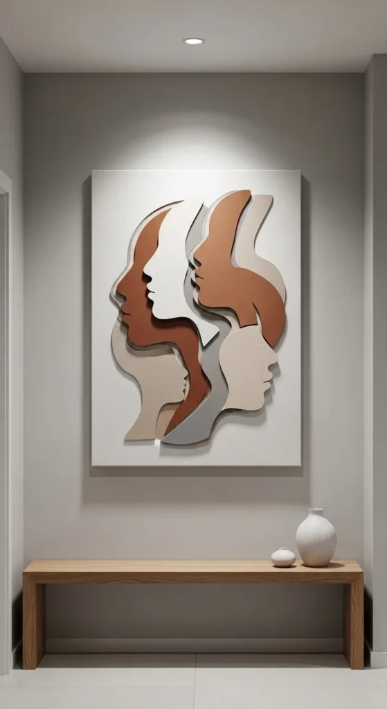 Silhouette cutout art feels clean and sculptural. Trace shapes onto canvas or MDF boards. Human profiles, leaves, or arches work beautifully.