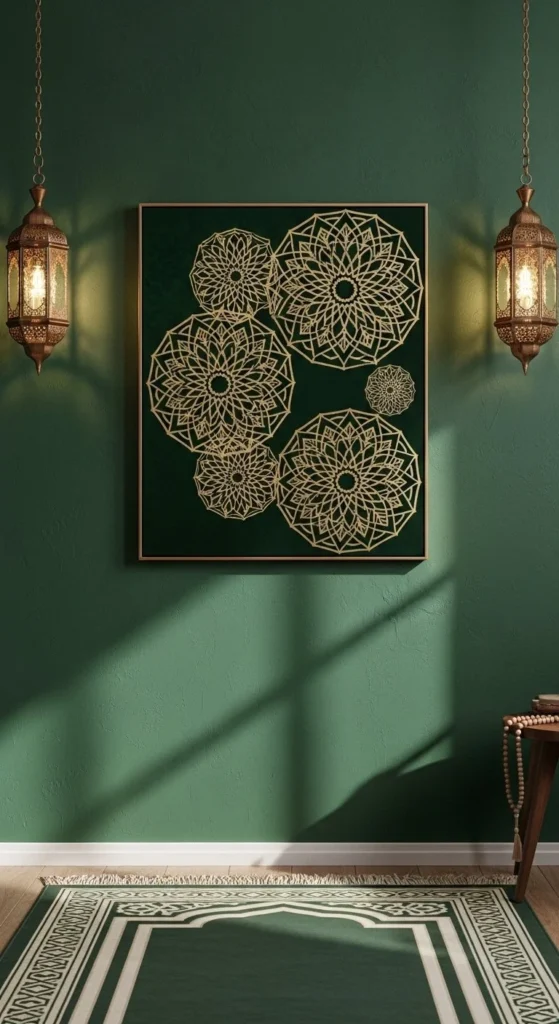 Islamic geometric art brings symmetry and heritage into decor. Use reusable mandala stencils on painted canvas. Deep jewel tones work beautifully as bases.