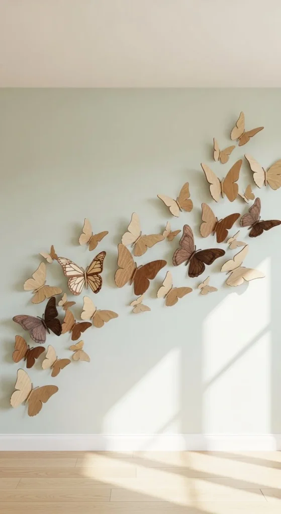 3D butterfly walls feel airy and sculptural. Use thin plywood or MDF cutouts shaped like butterflies. Print textures or hand-paint wing details.