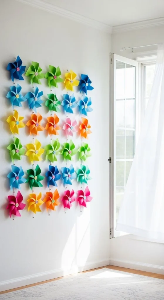 You can also cluster pinwheels into wreath shapes for seasonal walls.