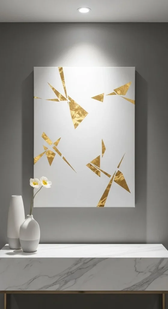 Entryways and dining rooms benefit most from metallic shine. Light reflects off the leaf, adding dimension. Even small canvases feel upscale with this technique.