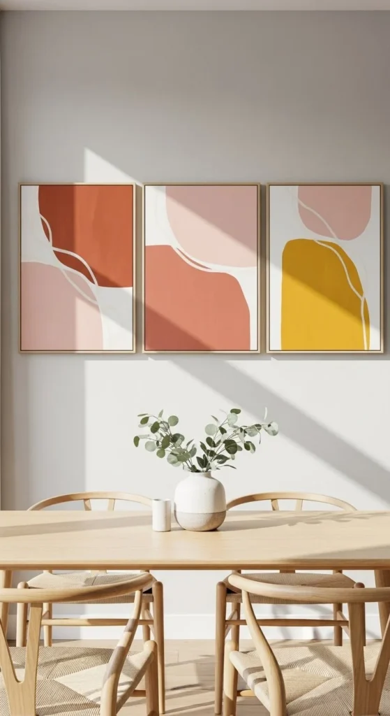 Canvas boards keep costs down. You can also paint directly on MDF panels. Hang panels in triptychs for balance. Dining rooms and hallways benefit most from bold geometry.