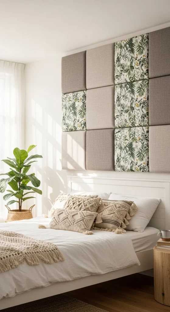 Fabric panels double as art and texture. Start with canvas frames or foam boards. Stretch fabric tightly across the surface. Staple or glue at the back.