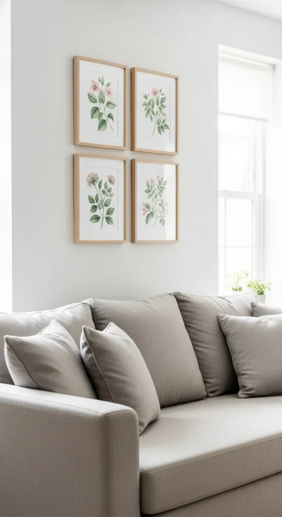 Botanical artwork brings calm energy into a room without overpowering it. Choose prints with loose brushstrokes and muted tones for a graceful look. Light wood or thin gold frames feel especially fitting for spring. You don’t have to buy expensive originals. Printable art from online marketplaces works beautifully when paired with quality paper. Thrift stores are another goldmine. Swap out artwork seasonally to keep things feeling intentional. Keep spacing consistent for a tidy gallery effect. Hang slightly lower than eye level for a cozy feel. Add a small picture light above the grouping for a subtle glow at night. Soft color palettes help the artwork blend naturally into your space. If your walls are dark, choose white mats to brighten things up. Botanical art also looks lovely in bedrooms, hallways, and even bathrooms.