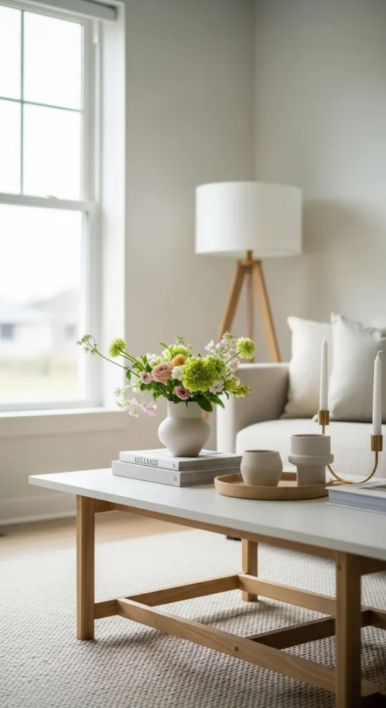 Light wood furniture brightens spaces naturally. Coffee tables in oak or ash feel airy and timeless. Look for simple shapes and visible grain. Style with a tray, small stack of books, and one decorative object. Avoid overcrowding. If replacing furniture isn’t possible, consider refinishing a dark table with lighter stain. Natural wood tones pair well with nearly any color scheme. Protect surface with coasters and trays.
