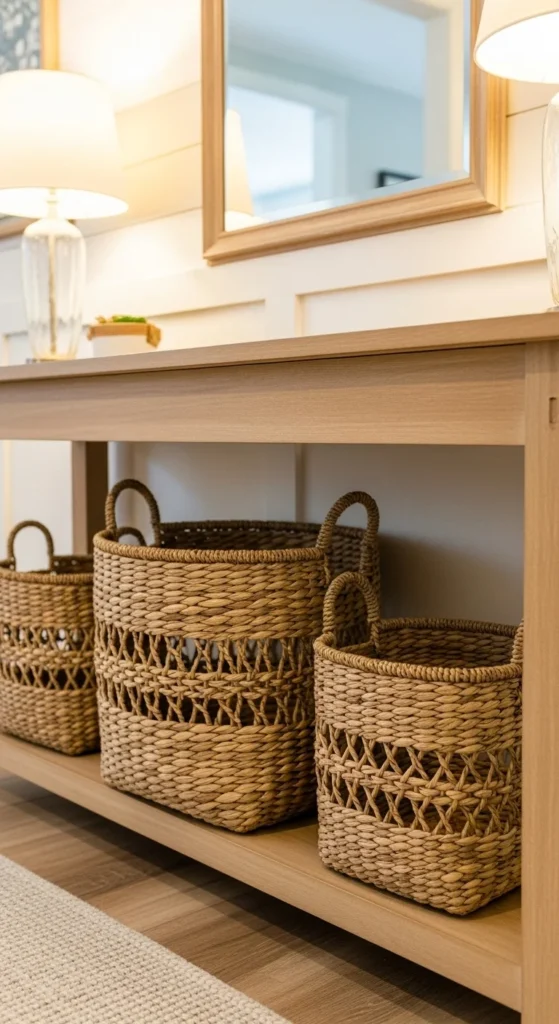 Woven baskets hide clutter while adding texture. Use them for blankets, magazines, or shoes. Natural fibers bring warmth to hard surfaces. Choose simple weaves for a cleaner look. Stick to one basket style for consistency. Line baskets with fabric if storing delicate items. Hidden storage solutions keep rooms tidy and calm. Vacuum occasionally to remove dust.