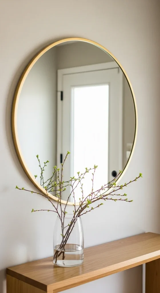 Mirrors bounce light and open up rooms. Thin gold frames add warmth without feeling heavy. Hang above consoles, dressers, or mantels. Keep surrounding decor minimal. Wipe glass weekly for a clear reflection. Thrift stores often carry quality mirrors. Reflective surfaces enhance brightness naturally. Avoid overcrowding the wall around the mirror.