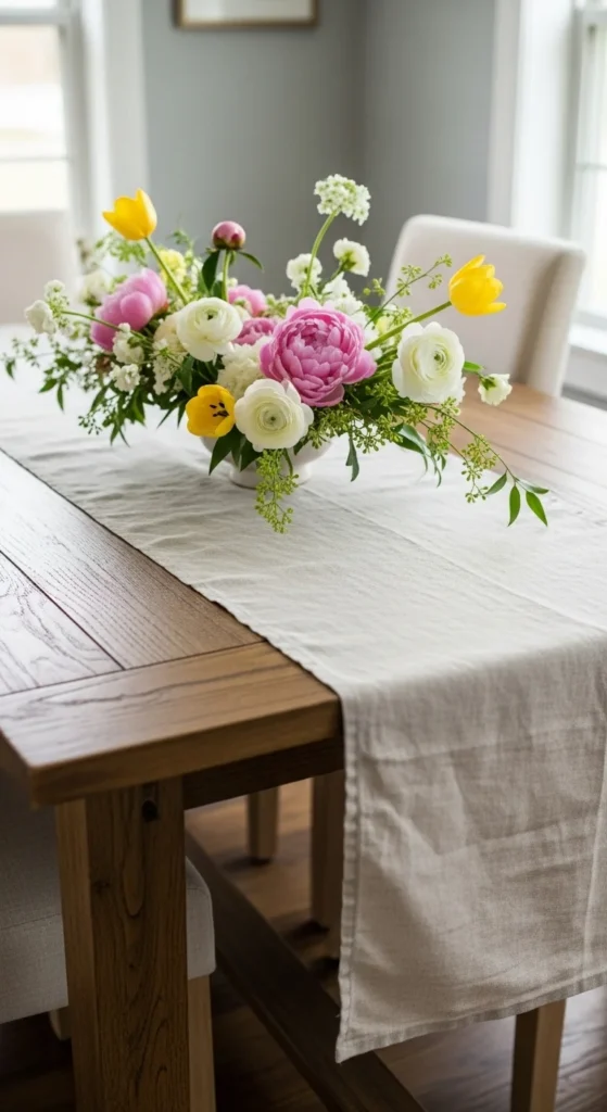 A table runner adds softness without covering the entire surface. Choose neutral linen or pale stripes. Let ends drape slightly. Iron lightly or embrace gentle wrinkles. Layer over bare wood or a simple tablecloth. Soft fabric layers create warmth. Wash on cold and air dry.