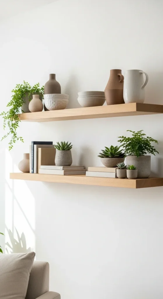 Floating shelves provide display space without bulk. Keep styling minimal. Mix vertical and horizontal objects. Leave breathing room between items. Use anchors for secure mounting. Airy wall storage works in kitchens, living rooms, and bathrooms. Rotate decor seasonally.