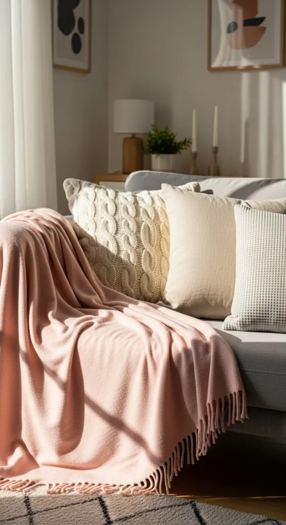 A pastel throw introduces color without commitment. Blush, sage, or pale blue work well. Drape casually over sofa or chair. Choose breathable cotton or lightweight knit. Seasonal textiles refresh rooms quickly. Fold neatly when not in use.