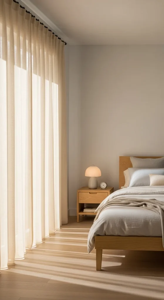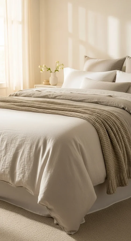 Layered neutral bedding creates a hotel-like feel without feeling stiff. Start with crisp cotton sheets. Add a linen or lightweight quilt. Finish with a soft duvet and one folded throw. Stick to warm whites and gentle beige tones for cohesion. Vary textures instead of colors to keep things interesting. Wash bedding with gentle detergent to preserve softness. Rotate layers seasonally to adjust warmth. Texture-driven styling keeps neutral palettes from feeling flat. Keep decorative pillows minimal for a clean look. Fluff bedding daily to maintain shape and volume.
